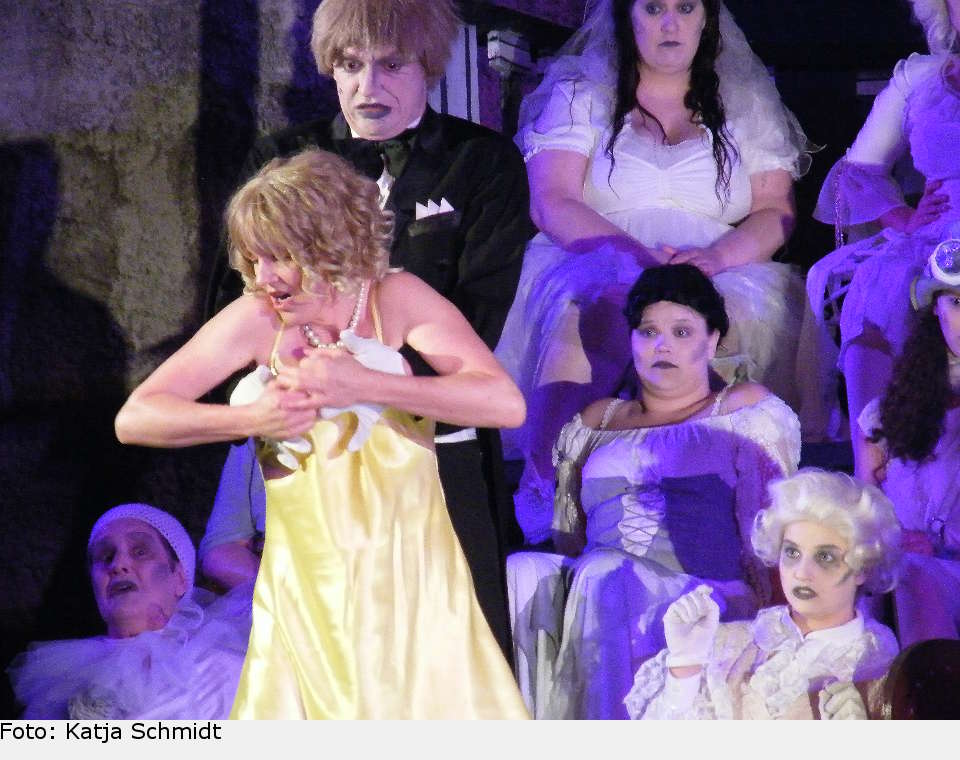 Andrea Werthwein als seine Gattin Morticia lässt sich da gerne mitreißen, gibt aber ansonsten die Unterkühlte, die in tief ausgeschnittenem schwarzen Abendkleid durchs Haus schreitet und mit einem einzigen eleganten Verschränken der Arme wortlos Anweisungen erteilt. Nichts ist für sie wichtiger als Ehrlichkeit – eine Einstellung, die man bei den abgedrehten Addams‘ gar nicht erwartet – und so bedarf es auch Gomez‘ ganzer Hingabe, um sie wieder zu versöhnen. Ebenso wie ihr Bühnengatte spielt Andrea Werthwein auf sehr hohem Niveau und lässt auch gesanglich nichts zu wünschen übrig. Ihr dunkel legierter Mezzosopran passt hervorragend zu Nummern wie „Der Tod steht um die Ecke“. Im Duett „Geheimnisse“ kontrastiert sie schön mit der hellen Stimme von Nicole Karrer, die als Alice Beineke in gelbem Kleid zunächst nur ihre bürgerlich-brave Seite zeigt, bevor sie sich nach einem versehentlichen Schluck „Acrimonium“ selbiges völlig enthemmt vom Leib reißt und mit derart derben Ausdrücken um sich wirft, dass Morticia ihrem Sohn verschämt die Ohren zuhält.